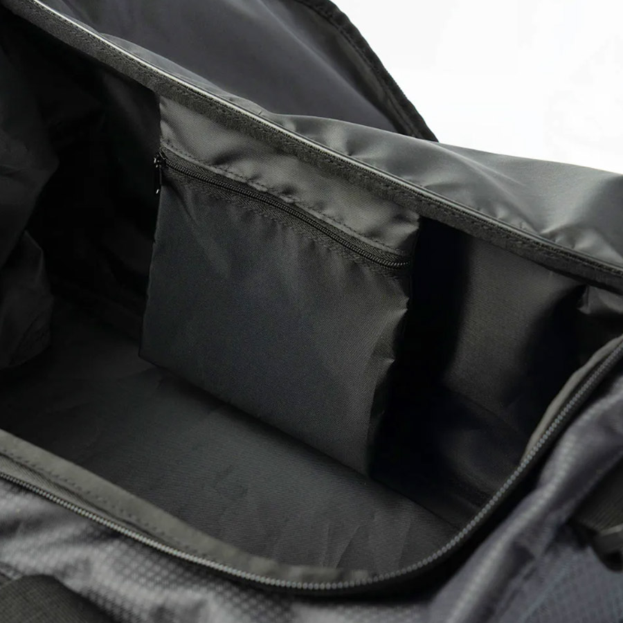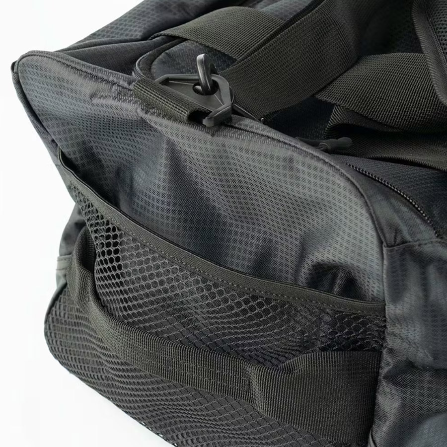 Smaller gym bag with a main compartment. Two carry handles and one adjustable shoulder strap. Large front zipped pocket, two side mesh pockets for loose items and a small internal zipped pocket for personal items. Also, includes a side zipped ventilated footwear compartment, or wet/dry pocket, for storage. Can hold a drink bottle. Dimensions: 45cm x 25cm x 25cm. 100% polyester.