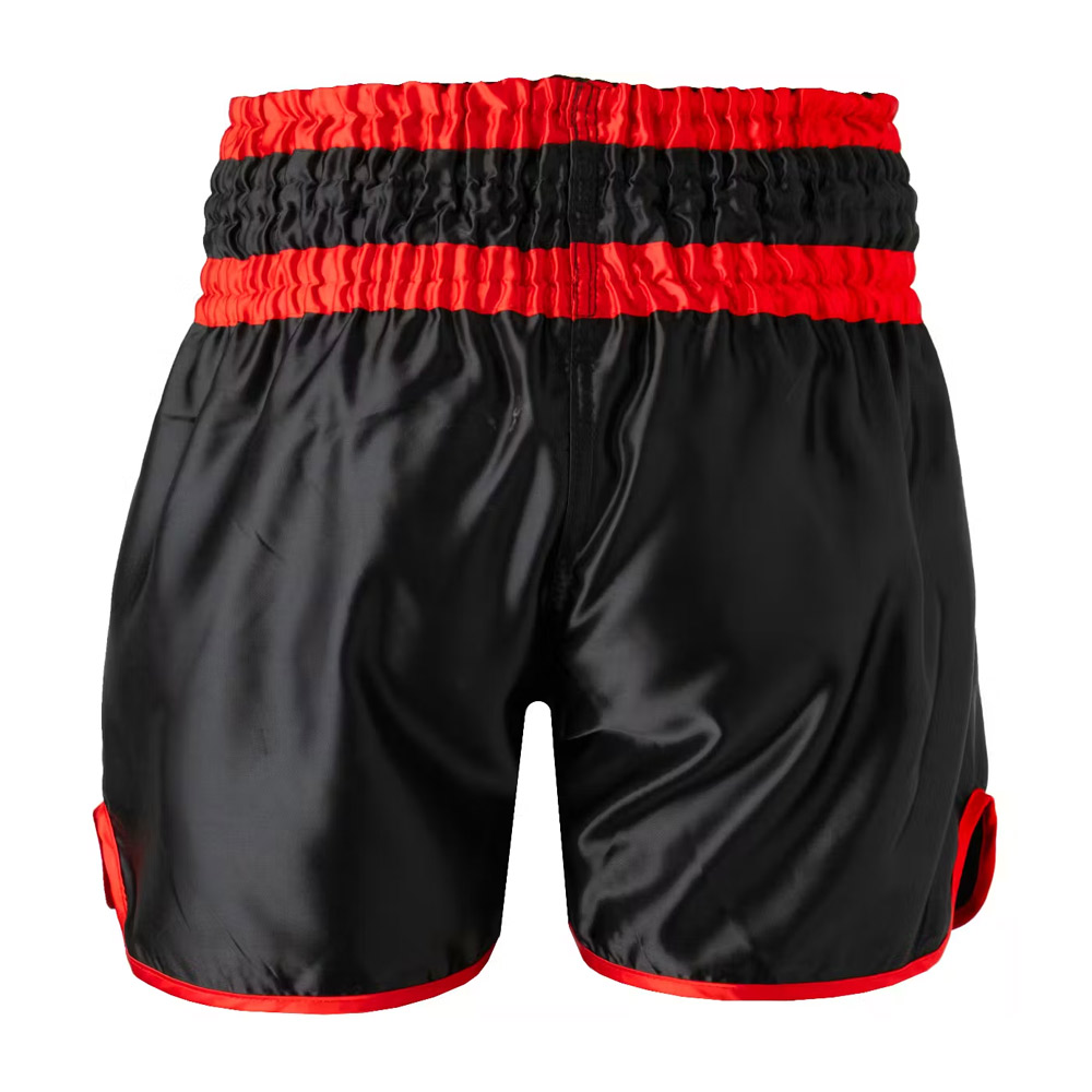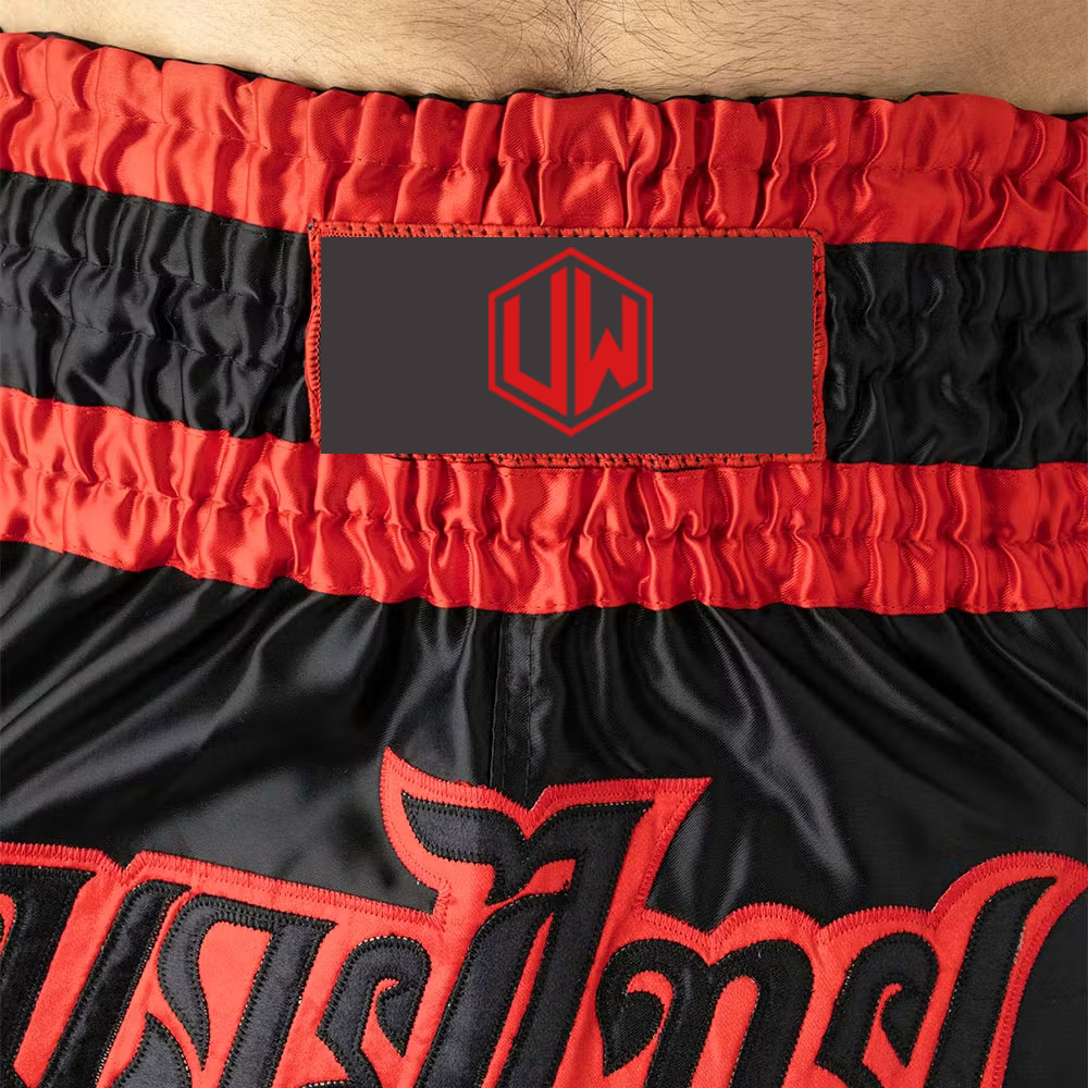 Designed with Muay Thai fighters in mind, our Classic Muay Thai Shorts are ultra-lightweight and free-flowing to allow for a full range of movement. The mid-thigh cut, wider leg design, with small side splits, ensure unrestricted movement; and, maximises function and comfort for the wearer when training or competing. The large elasticated waistband, with drawstring, provides a secure fit. The minimalistic black base, with a red trim, Umer Well logo on the waistband and red Muay Thai text on the front, allows clubs, gyms and athletes to add their own choice of branding too. Polyester.