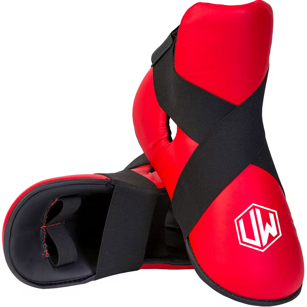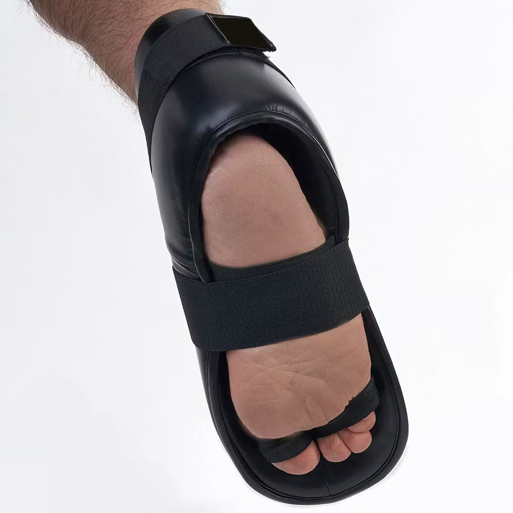 Made from tough, anti-slip Nama Hideâ„¢ Leather, this semi contact foot protector is specifically designed for the use of semi contact and Kickboxing. A wrap-around Velcro strap at the back and elastic strap underneath improves comfort and fit to enhance performance. Easy to wipe clean before and after use.